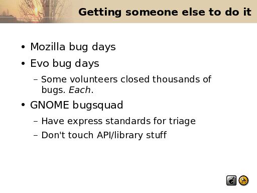 This slide is the one I was most reticent to show here, because it's possibly the least relevant to the kernel. GNOME gets along on bugs not because of me, but because over the last two years hundreds of evolution and GNOME users have stepped forward to clean up our bugzilla. It's really hard to know if the kernel can do the same. The release cycle is totally different (daily snapshots help drive a lot of our interest) and the nature of the bugs is very different as well. Hopefully the volume is lower as well :) At any rate, getting outside help is key- even just a part-time bugmaster or a small volunteer squad can help clean things up a lot. *cough*janitors*cough* If developers are doing it on their own (as Dave seems to feel he is) then a QA process is likely to fail.