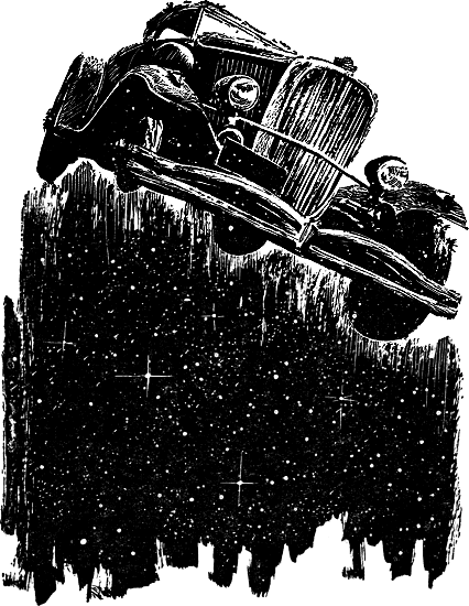 "Comrades," said the senior technician, "notice the clear view of North America. From here we watch everything; rivers, towns, almost the people. And see, our upper lens shows the dark spot of a meteor in space. Comrades, the meteor gets larger. It is going to pass close to our wondrous machine. Comrades ... Comrades ... turn to my channel. It is no meteor—it is square. The accursed Americans have sent up a house. Comrades ... an ancient automobile is flying toward our space machine. Comrades ... it is going to—Ah ... the picture is gone."
