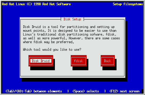 Select the disk partitioning tool you'd like to use, and press [Enter]. If you choose Disk Druid, continue reading. If you'd rather use fdisk, please turn to Section 4.3.2.