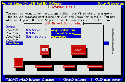 To add a read-only NFS-served filesystem, press [F2]. If you have not selected a network-related installation method, you will be presented with several dialog boxes concerning network configuration (Turn back to Section 3.4.3 for more information). Fill them in appropriately. You will then see a dialog box entitled, ``Edit Network Mount Point'' (similar to the one in Figure 23). In this dialog box you will need to enter the NFS server name, the path to the exported filesystem, and the mount point for the filesystem. Select the Ok or Cancel button as appropriate, and press [Space].