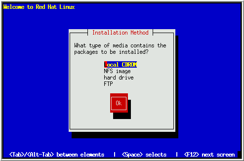 If you are going to install Red Hat Linux from a locally-attached hard drive, highlight ``hard drive'' and select OK.
