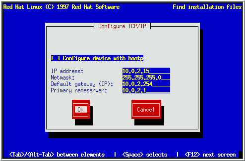 The first dialog asks you for IP and other network addresses (see Figure 11). Enter the IP address you are using during installation and press [Enter]. The installation program attempts to guess your Netmask based on your IP address; you may change the netmask if it is incorrect. Press [Enter]. The installation program guesses the Default gateway and Primary nameserver addresses from your IP address and netmask; you may change them if they are incorrect.