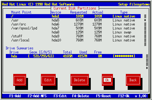 To Add a new partition, select the Add button, and press [Space] or [Enter]. A dialog box entitled ``Edit New Partition'' will appear (see Figure 17). It contains the following fields: