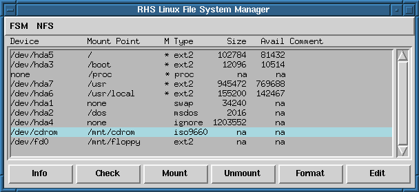 The file system configuration tool shown in Figure 52 allows you to easily examine and manipulate file system mount points, types, options, etc. It is very useful for manipulating a large number of file systems. You probably don't want to do this unless you are an experienced system administrator. If you do know what you are doing, it should be fairly straightforward as to how to mount, unmount, and add devices.