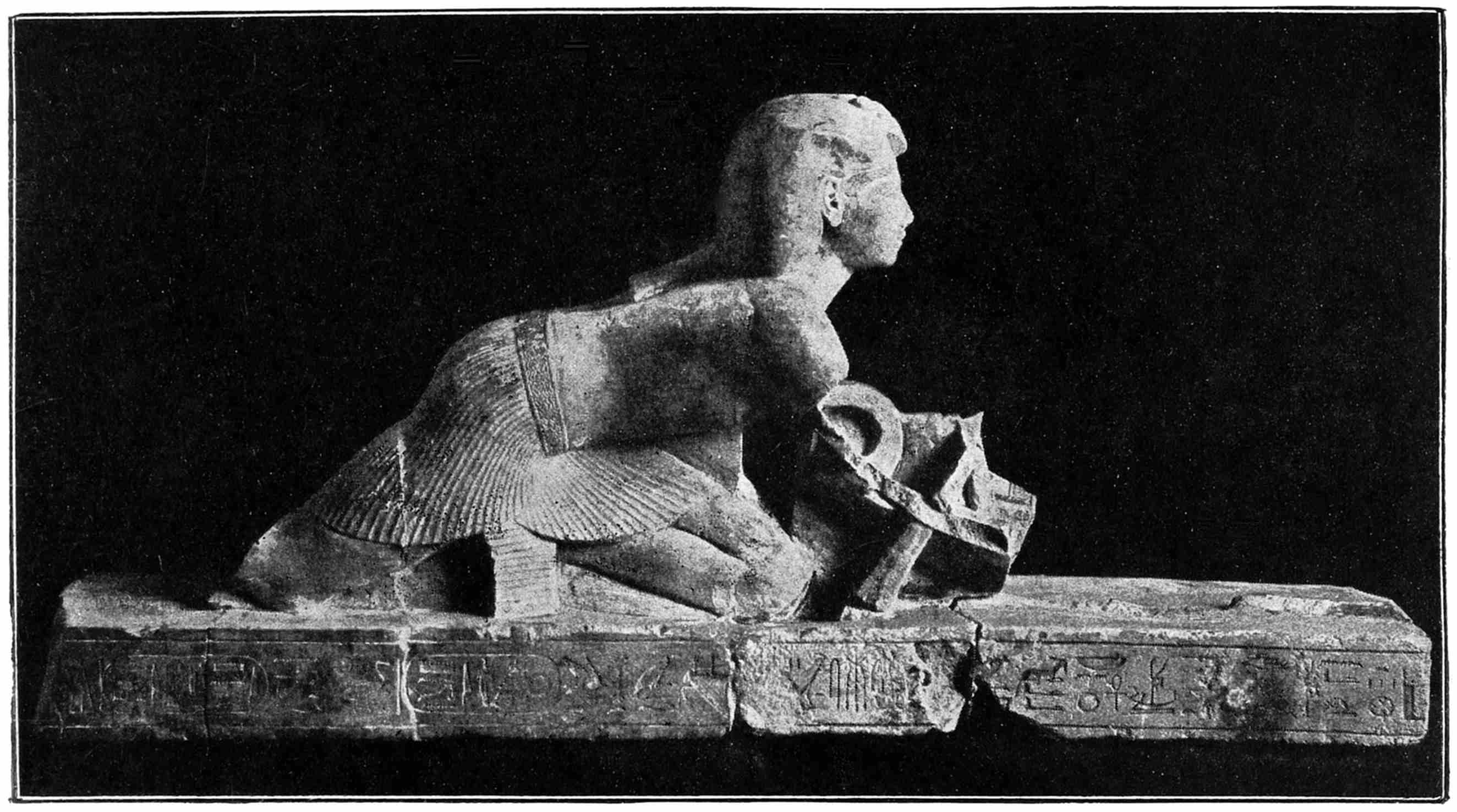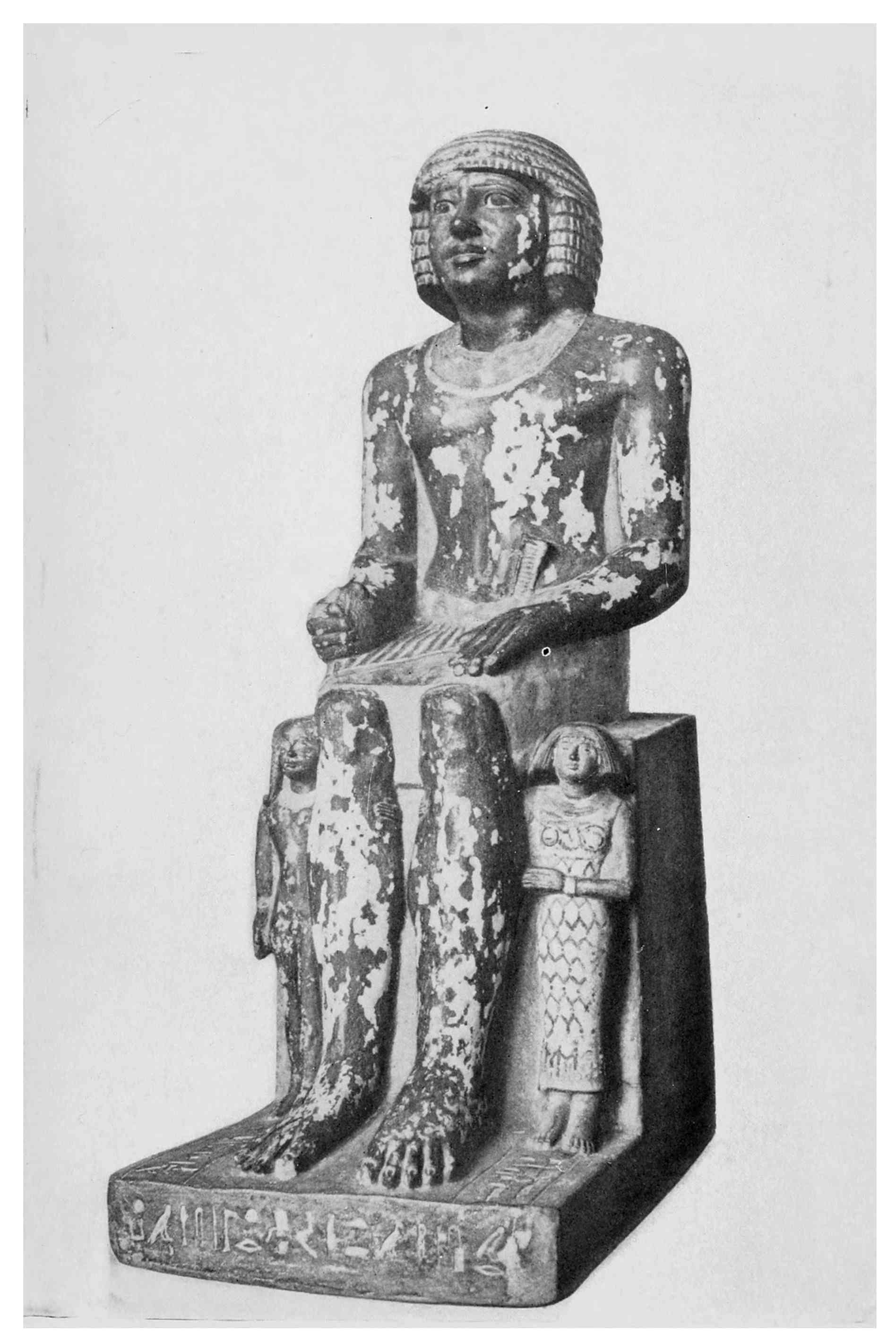 37 Mariette, “Notice des principaux monuments du Musée de Boulaq,” 6th edition, 1876, p. 235, No. 769: “Memphis. Saqqarah—limestone II, 1 foot 2 inches—kneeling figure. His hands crossed on his legs. His eyes are of mosaic work and formed of several stones curiously combined.” The statue of the kneeling scribe figures in a group in Plate XX of Mariette’s work, “Album du Musée de Boulaq,” containing 40 plates, photographed by MM. Délié and Béchard, with explanatory text edited by Auguste Mariette-Bey. Cairo, Mourès et Cie, 1871, fol.