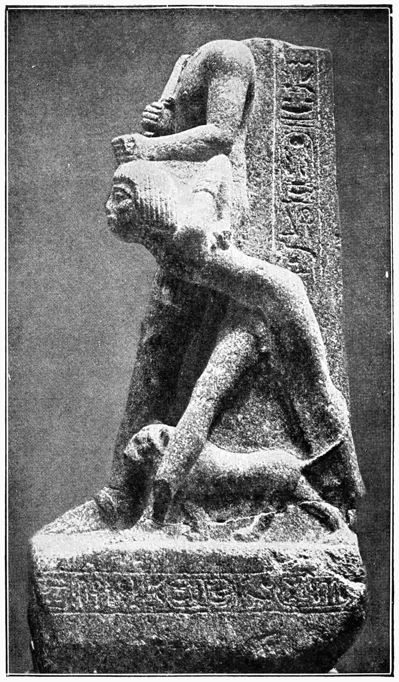 It was announced in the English newspapers, and the French followed suit, that a ship had recently reached London and disembarked 180,000 mummies of Egyptian cats. For a long time manufacturers of different nationalities have been accustomed to seek out the burying grounds of animals throughout Egypt, and to export the bones to Europe, where they are used as manure. A few years ago a necropolis full of monkeys was sent to Germany to manure beet-root fields. It seems that the cats of this year were discovered near Beni-Hassan; they were piled up at hazard in a sort of cavern, into which a fellah in search of antiquities was the first to penetrate. In fact, at some distance to the south of the hypogeums of Beni-Hassan, in the place called by geographers Speos-Artemidos, is a chapel hollowed out in the rock, and consecrated by the kings of the XVIIIth and XIXth Dynasties to a local goddess, a woman’s body with a cat’s or lion’s head, called Pakhît. The depôt recently exploited was found there, and the cats which reposed in it must have lived in the vicinity, under the protection of their cousin, the goddess. Cemeteries of the same kind existed wherever a divinity of a feline type was worshipped,215 lion, tiger, or cat. The most celebrated was at Bubastis, in the delta, where the seekers of antiquities cleared away the rubbish about thirty-seven years ago.95 The mummies of cats were buried there in favissæ, deep pits, some merely wrapped in swathings, others enclosed in little coffins reproducing the image of the animal. Some of these coffins are entirely of wood covered with white stucco, gilded, painted in bright colours; some are in bronze, others have the body in wood and the head in bronze, with gold rings in their ears and encrustations of gold on the forehead and in the eyes. Statuettes of cats of different sizes, portraits of the goddess Bastît with a cat’s head, or of the god Nofirtoumou, are mingled with the mummies. Thence come the thousands of bronze cats, big and little, with which all the antiquaries of Europe and Cairo were so abundantly provided from 1876 to 1888. The important cat illustrated here, and who lives now in one of the glass cases in the “Salle divine” of the Louvre, is a perfect type of the species, long, slender in the back, broad in the hind-quarters, with a delicate, well-set head, rings in the ears, a necklace round the neck, and a little scarab on the top of the head; the artist who modelled it has rendered excellently and truthfully the supple bearing and the bold physiognomy of his original.