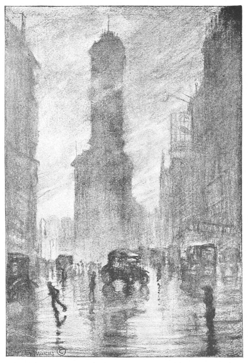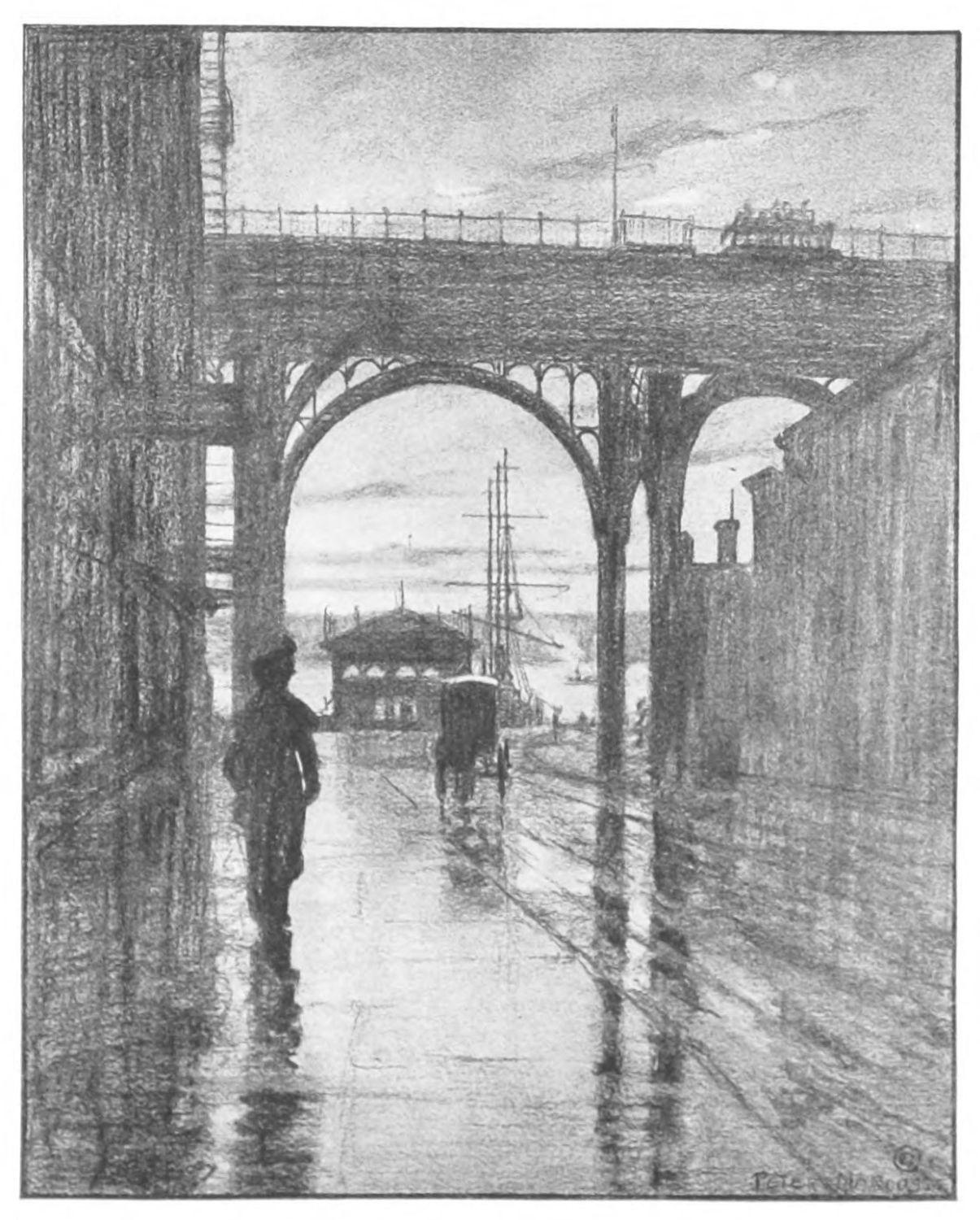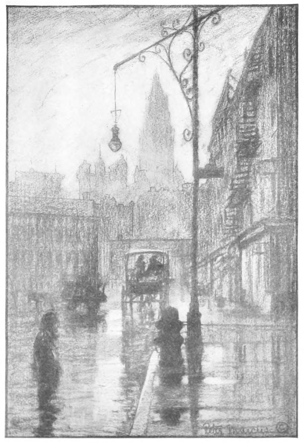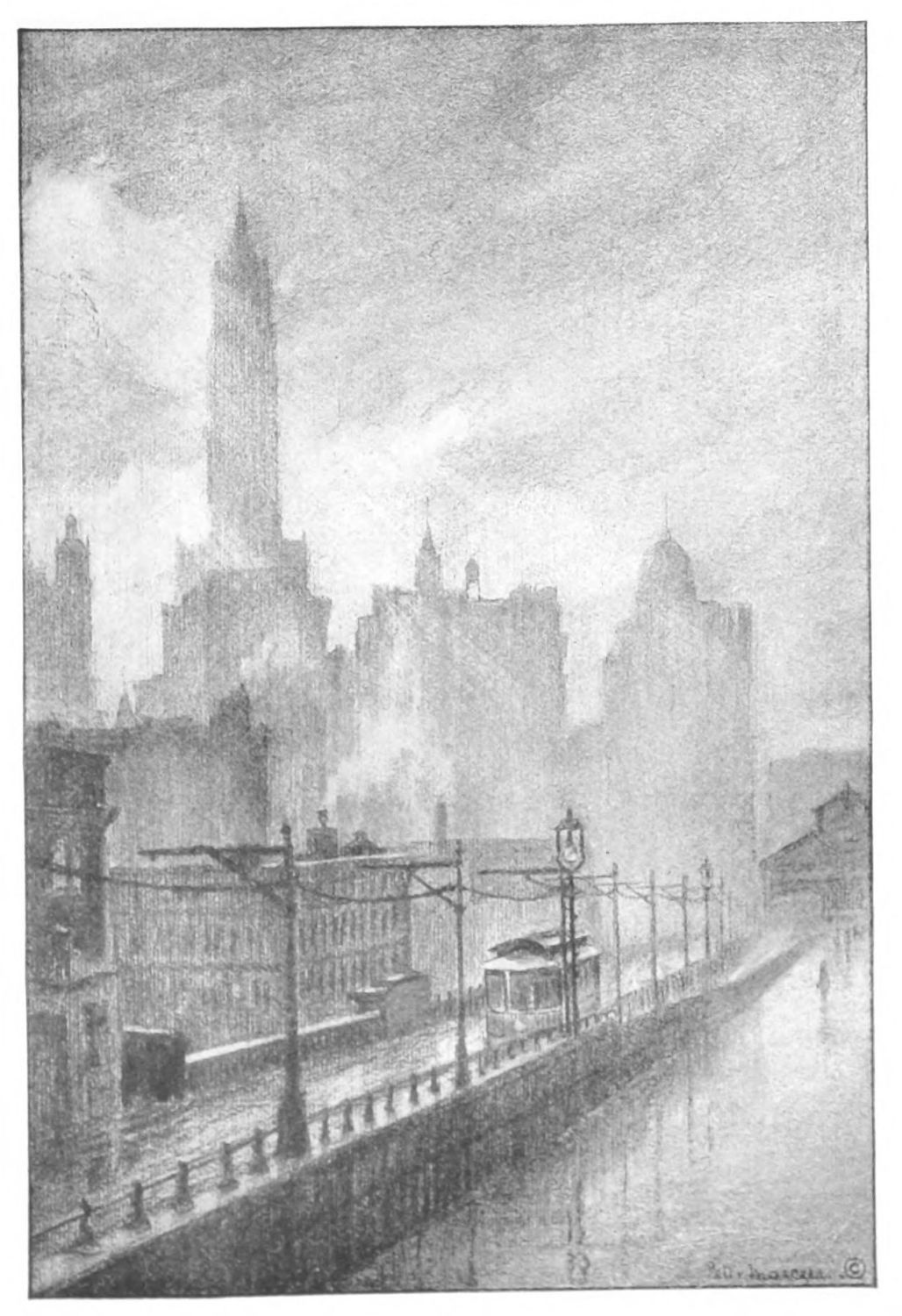 Hopkinson Smith once said that Venice is nothing but air and water. There all else has been so softened and moulded and enveloped as to become part and parcel of sea and cloud. The portrayal of this is preëminently a painter’s job. But New York, in addition to being a lot of other things, is a Venice in the making, and all the ugly paraphernalia by means of which this making is slowly going forward, all the unlovely processes, physical and chemical, structural and commercial, must be recognized and expressed and by the light of poetic vision be made a part of its beauty and romance.