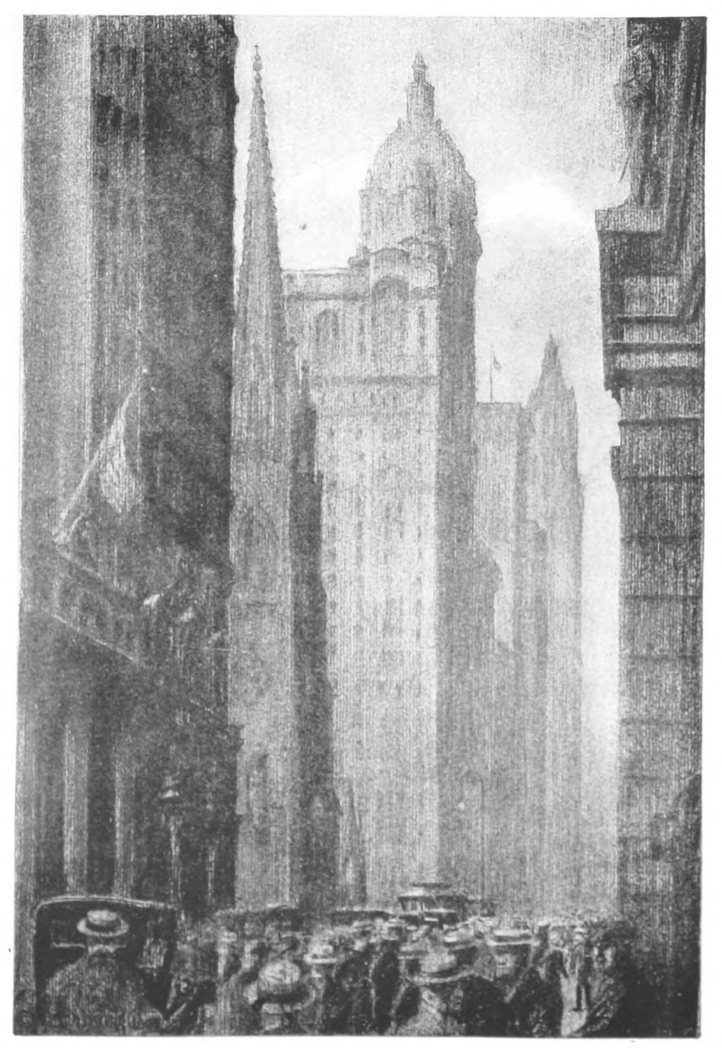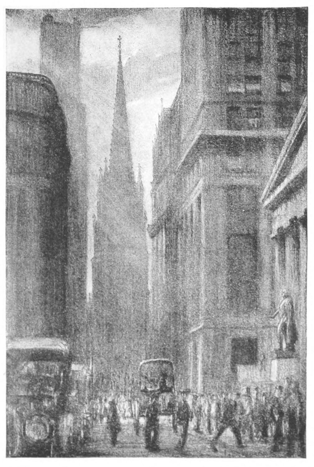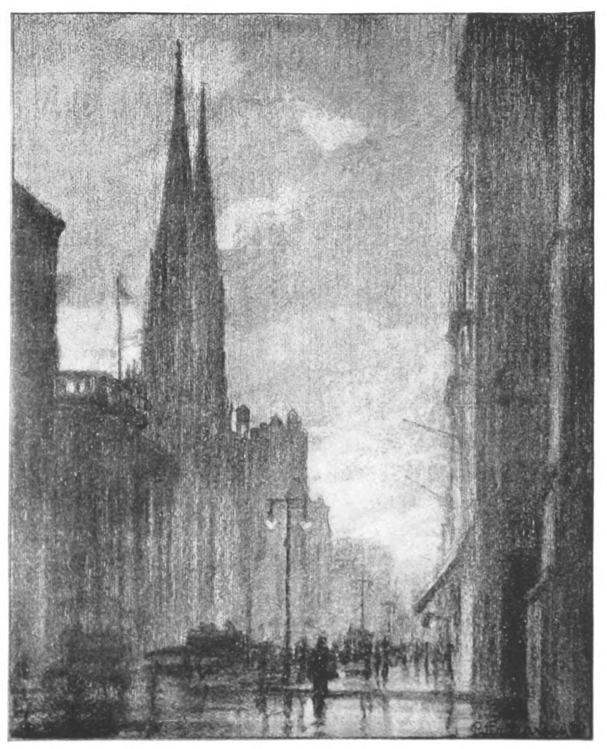 THE changes in New York in the last hundred years have been almost fabulous and yet the greatest of all perhaps has been lower Broadway. The proud steeple of Trinity Church once dominated a scene of fashion. It is now surrounded, dwarfed, overshadowed. Once Beaux and Belles, in Brummel-like hats and directoire skirts, came grandly here to worship,—and meant it. To-day, one picnics in the church yard and eats luncheon bananas on the graves. The enormous buildings of commerce, finance and trade are filled to overflowing. Here is progress, wealth and unlimited resource. It is a tremendous hive full of golden honey. And it is doubtless very good. But it is also good that this small church of a bygone time, still stands undaunted,—respected among these colossal towers; and that it still brings from the past some of that calm strength that is of even more lasting stuff than the masonry of the church itself, and that through it, the spirit of Old New York still “carries on” in Lower Broadway.{19}