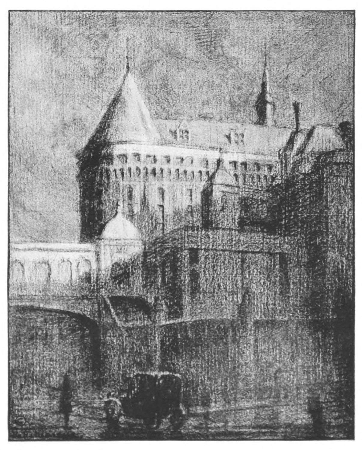 WHO can look at a prison without being glad that he is not in it? At the corner of Lafayette and Franklin streets is the great gray pile that is the Tombs. Its turrets, towers and narrow windows suggest dungeon keeps and feudal castles; its heavy gateways,—medieval strongholds. Its high exterior wall and “Bridge of Sighs” make one remember the lugubrious histories of the Doge’s Palace and of the Tour de Nesle. Those inside bear the double burden of being imprisoned and of knowing that close about them is all the life of the great city: its lights, its restaurants, its countless activities and its friends. Yes, looking at the Tombs, grim as it is, makes one feel strangely fortunate.{31}