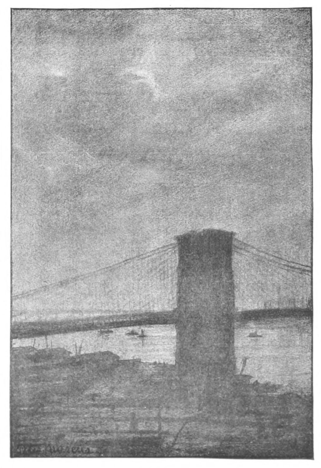 LIKE twin Colossi, silent amid the hum of cities and the whistling of a thousand boats, the grim piers of Brooklyn Bridge stand sentry at the river’s gate.{35}