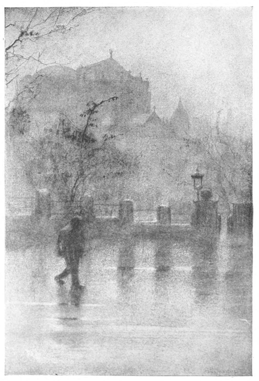 If in the drawings thus far mentioned certain qualities of Piranesi, Méryon and Brangwyn are brought to mind; in “High Bridge,” “The Soldiers’ and{13} Sailors’ Monument,” “Hell Gate Bridge,” “Grant’s Tomb,” and “The Cathedral on the Heights,” there is equally a suggestion of Whistler. Less vigorous than the others in draughtsmanship, they are full of the suggestion of subdued color. By reason of the more subtle quality of their rendering, they lend themselves less readily to reproduction but even the reproductions convey beautiful impressions of shadowy foliage and quiet waters, bare, wind-swept branches and lonely spaces.